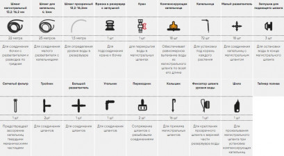 - Система укомплектована специальными компенсирующими капельницами, которые выравнивают давление воды в системе и обеспечивают одинаковый равномерный полив всех растений. Капельницы разборные, легко чистятся. А монтируются на шланге с помощью шила, идущего в комплекте.