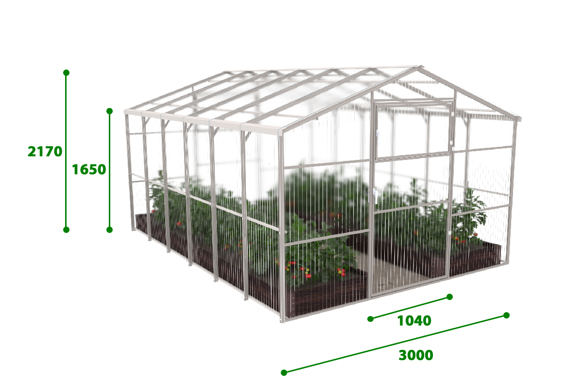Для удобства транспортировки торцы и дуги прямостенной теплицы изготавливаются разборными. Высота теплицы составляет 2170 мм, ширина 3000 ммм, длина 3095; 5915; 7880; 9845 миллиметров и т. д. (в качестве удлинения теплицы используются доборы 2 м).